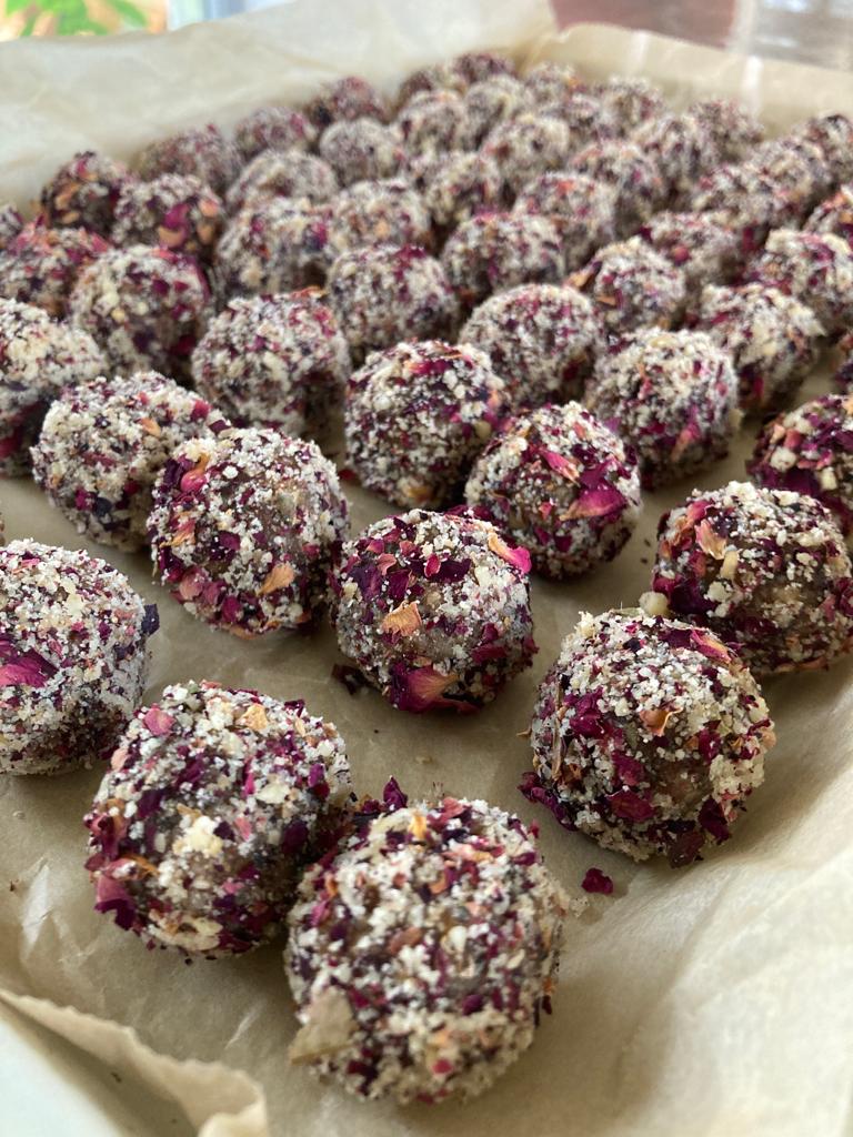A set of three high vibration energy balls filled with walnut, chia seed, flax seed, dates, rose water and rose petals. A healthy and energising snack when a pick me up is needed.