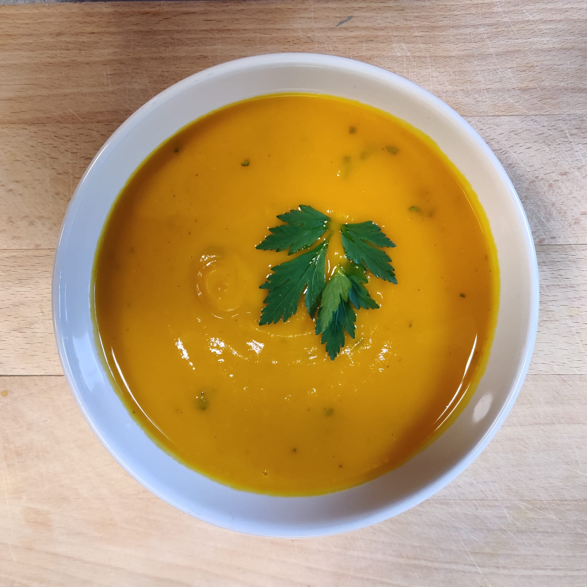 A sensational Kuri squash, pumpkin and sweet potato soup, mild and warming laced with fresh parsley